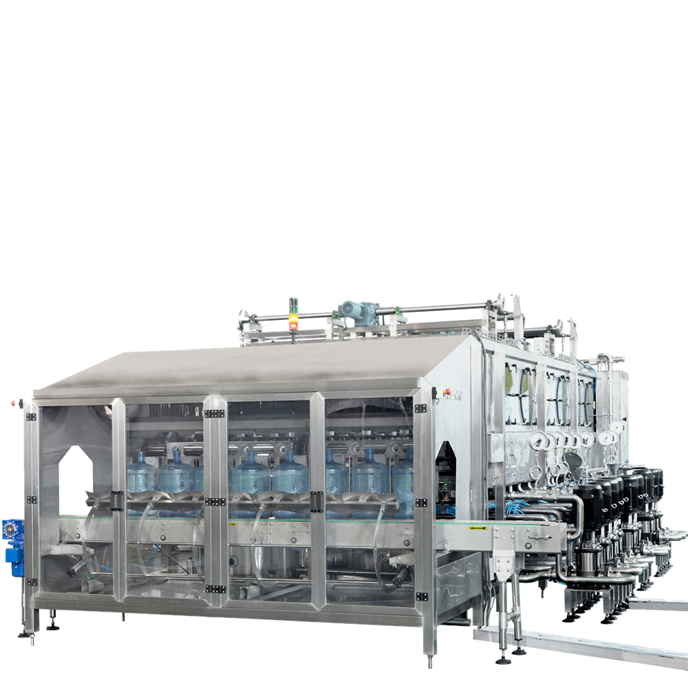 是五加侖桶裝飲用水生產線的主要生產設備;集自動上瓶、洗瓶、自動下瓶、自動出瓶于一體的新式機型;采用潔凈型墻板式結構、精確平穩的90度翻轉上下瓶子方式、衛生型U型 結構水箱、變頻控制全面沖洗等相結合,設備運行平穩,沖洗潔凈、全面維護方便,衛生等級高。適